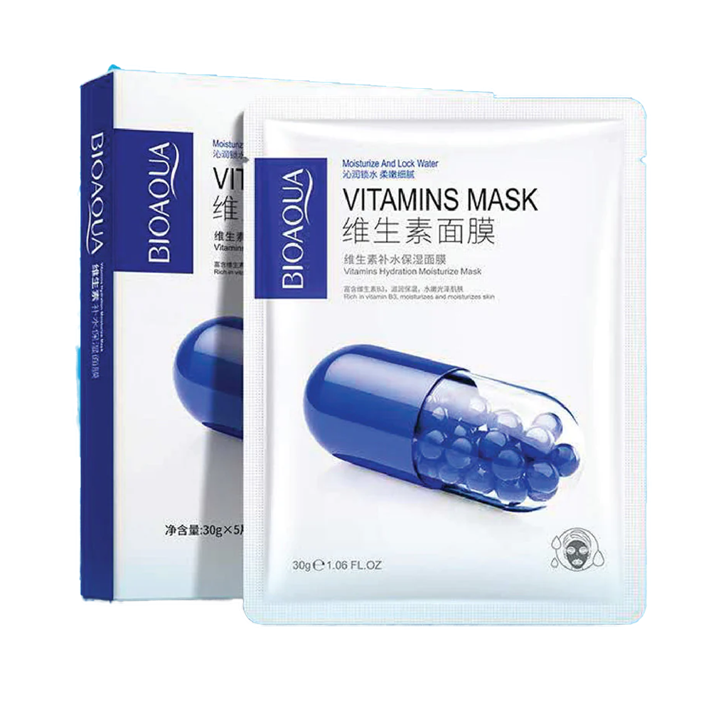 امنح بشرتك ترطيبًا مكثفًا وانتعاشًا فوريًا مع قناع الوجه الورقي BIOAQUA بالفيتامينات Hydration Moisture. كل قطعة من القناع مشبعة بمزيج غني من الفيتامينات والمكونات المرطبة التي تخترق البشرة لتغذيتها من الداخل، مما يساعد على: