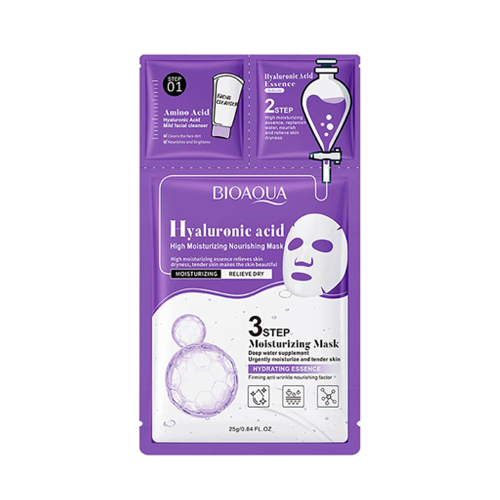 امنحي بشرتك تجربة عناية متقدمة مع قناع Bioaqua ثلاثي الخطوات بحمض الهيالورونيك، المصمم خصيصًا لترطيب البشرة الجافة وتجديد إشراقتها. يعمل هذا القناع بنظام ثلاثي المراحل لتقديم فوائد شاملة:
